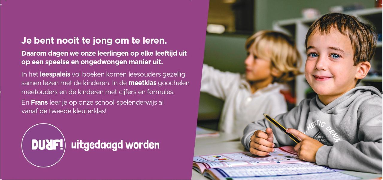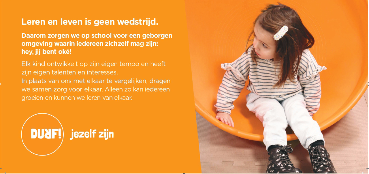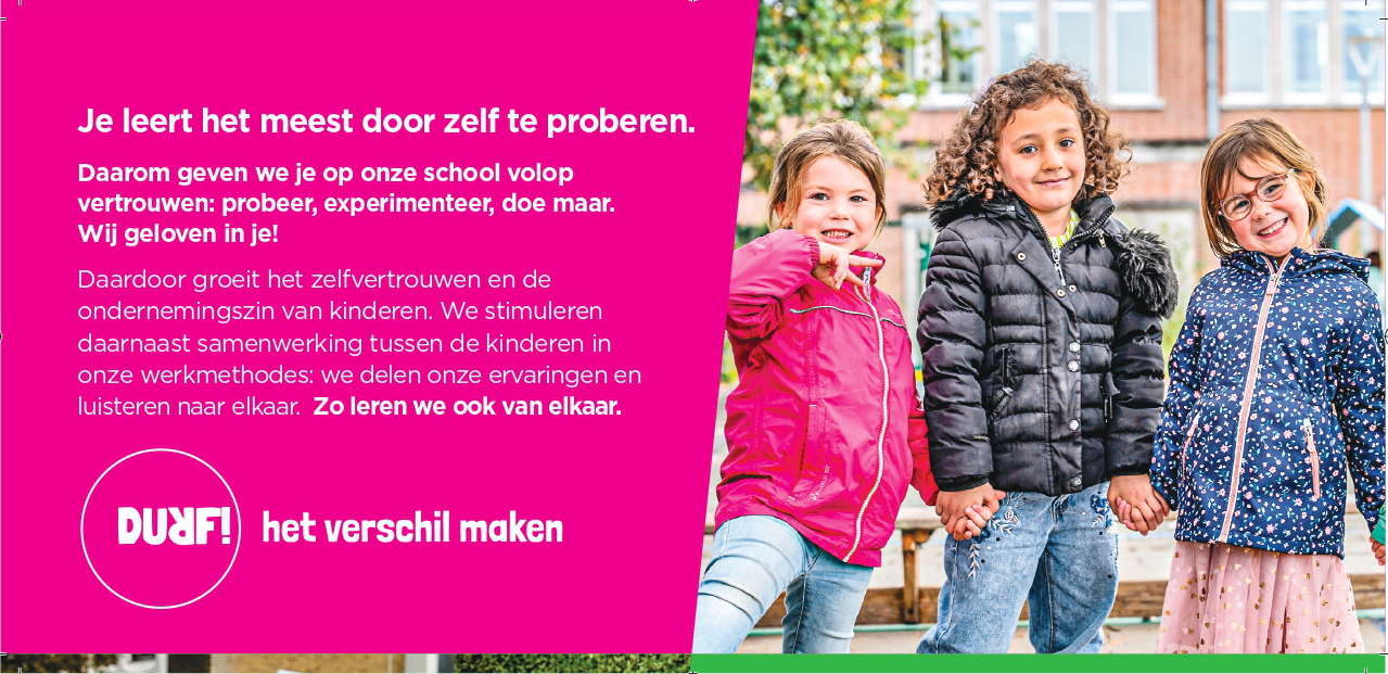 Waar ondernemingszin, zelfvertrouwen en enthousiasme voorop staan omdat deze eigenschappen later het verschil zullen maken? Waar je kind zichzelf mag zijn en onbevangen durft verder kijken, vragen stellen en uitgedaagd wordt met nieuwe leerstof en spannende projecten?